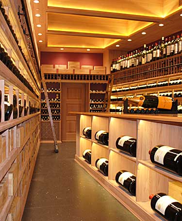 When building your wine cellar, consider temperature and humidity. Wines need to be kept at a cool 55 degrees Fahrenheit and with a 70 percent humidity level. Note that wine should lie on its side, allowing the cork and wine to maintain constant contact.